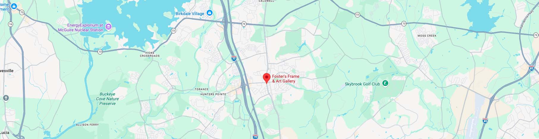 If you’ve ever found yourself daunted by all the different choices and options available when you’re ready to frame your latest original or photograph, then Foster’s Frame Design & Gallery is for you. Located in Huntersville, NC, our gallery provides a wide array of services to suit all your artistic needs. As a gallery, we have a rotating display of artwork–both original and limited artwork from national and local artists. We also provide high-quality, professional custom framing and pottery. So, if you’re looking for an experienced company well-versed in the field of art, look no further than Foster’s Frame Design & Gallery Inc.!